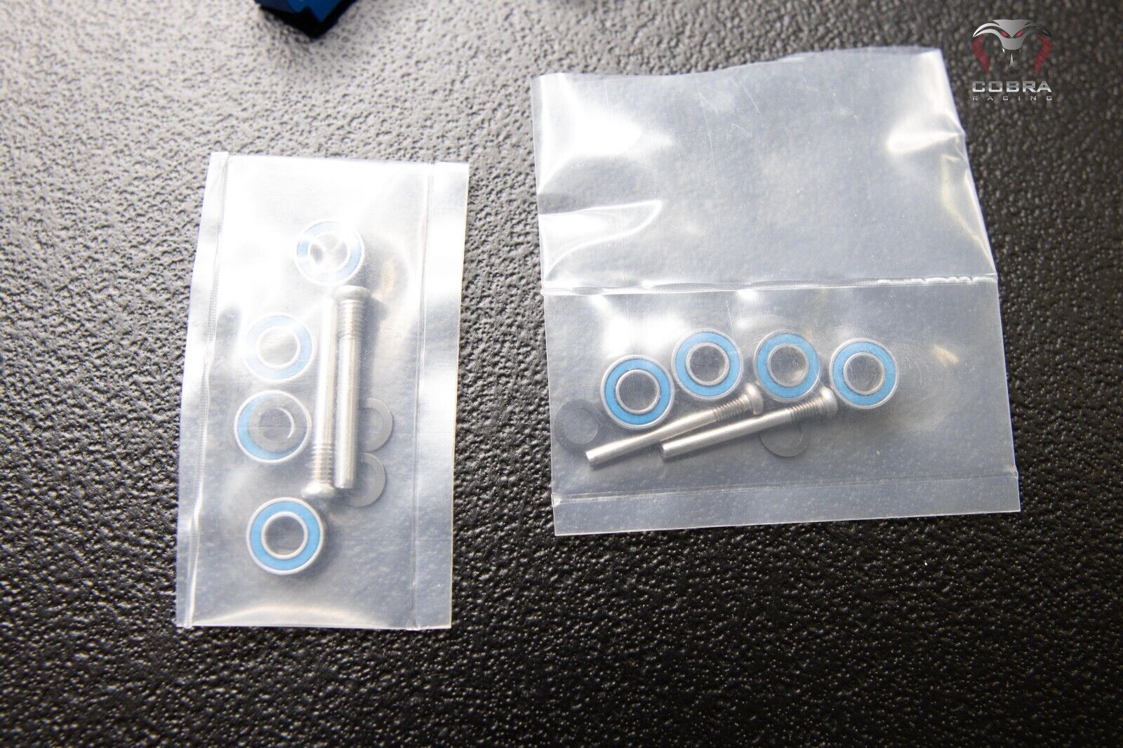- Whats included:ย ย 2 front steering blocks, 2 front caster blocks, 2 rear axle carriers, washers and screws, and a full set of ABEC5 high performance rubber sealed bearings.