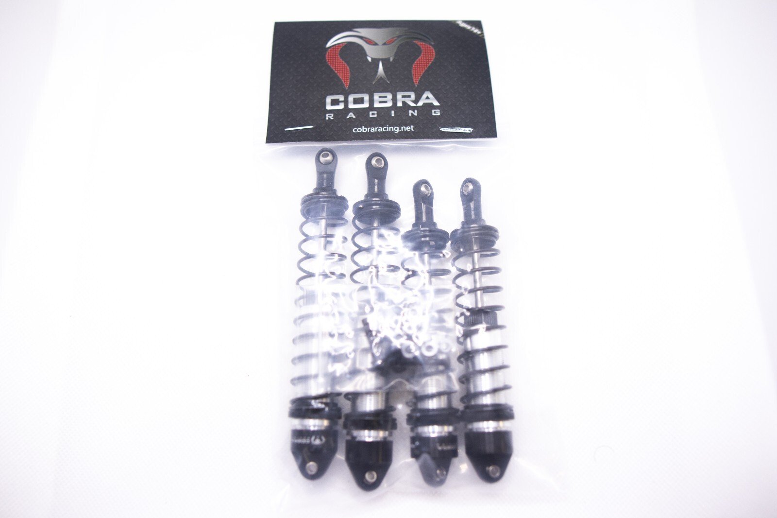 Upgrade your ride with the Cobra Racing Arrma 1/10 shocks for Big Rock, Senton, Typhon, and more. Made of 6061-T6 aluminum and comes in black and chrome. Full set for front and rear with all mounting screws and spacers included.