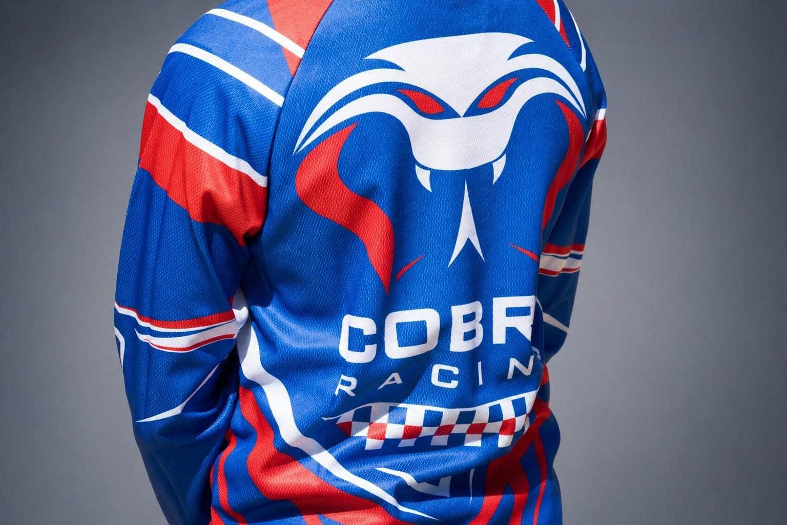 Features aggressive blue, red, and white Cobra Racing graphics across the front, back, and sleeves for a full race-inspired look.