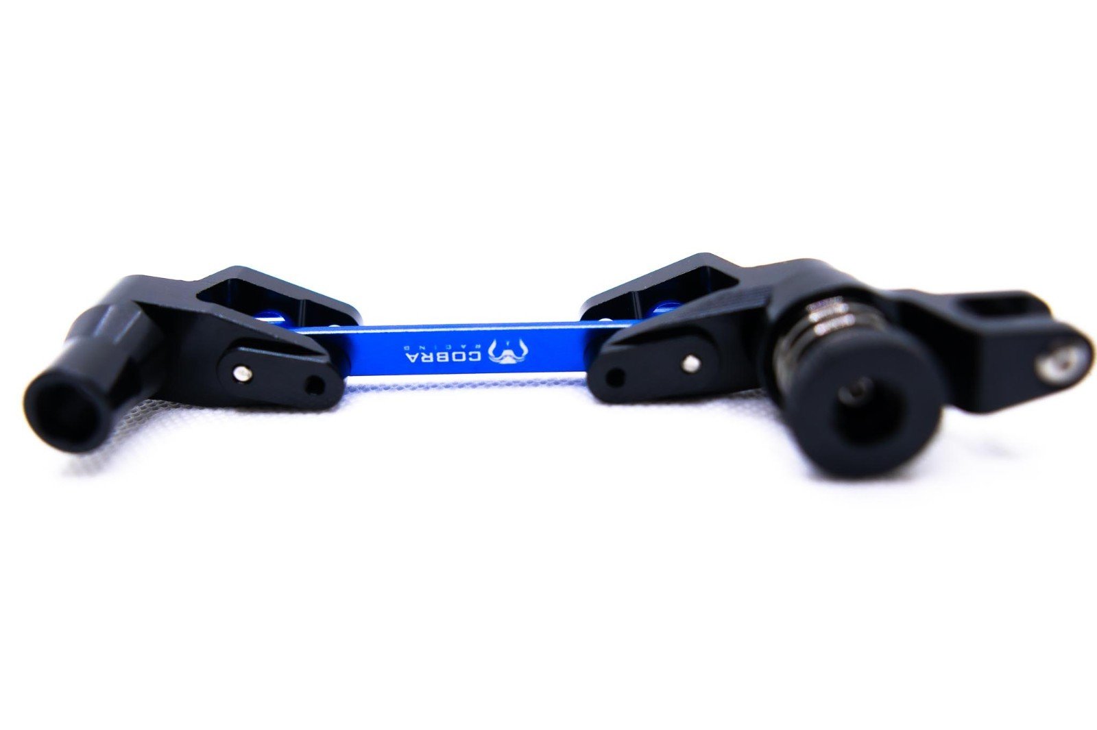 Features an eye-catching anodized finish with a sleek black bellcrank and a navy blue center brace — combining bold style with corrosion resistance.