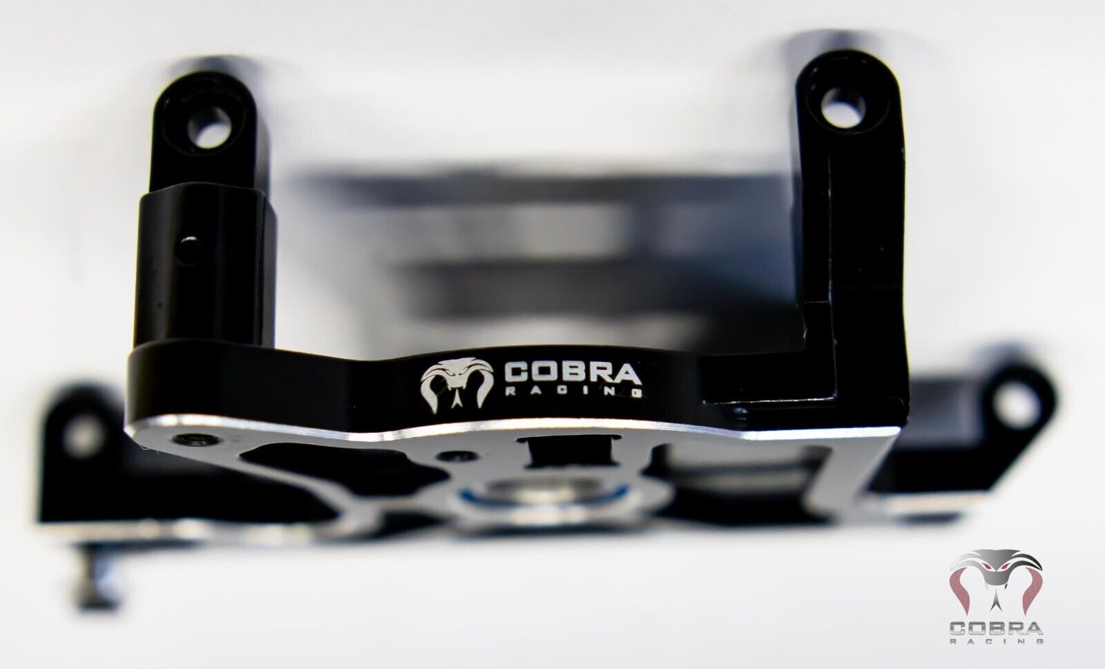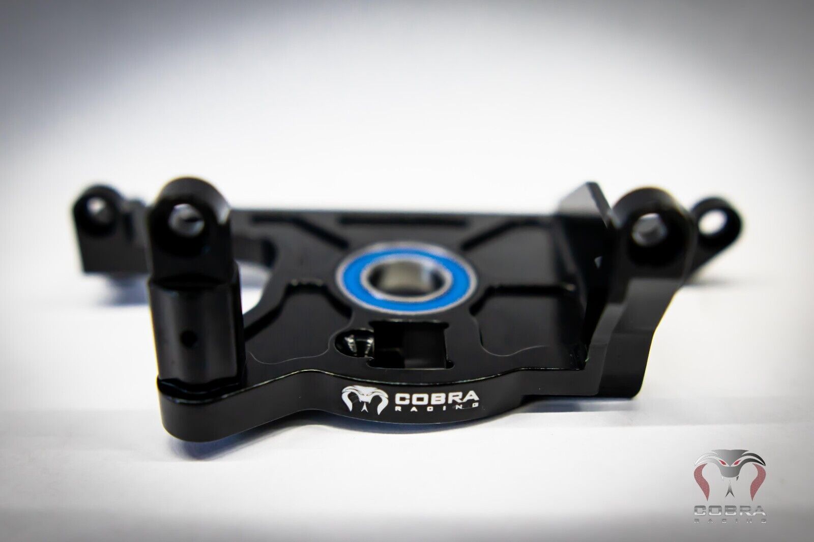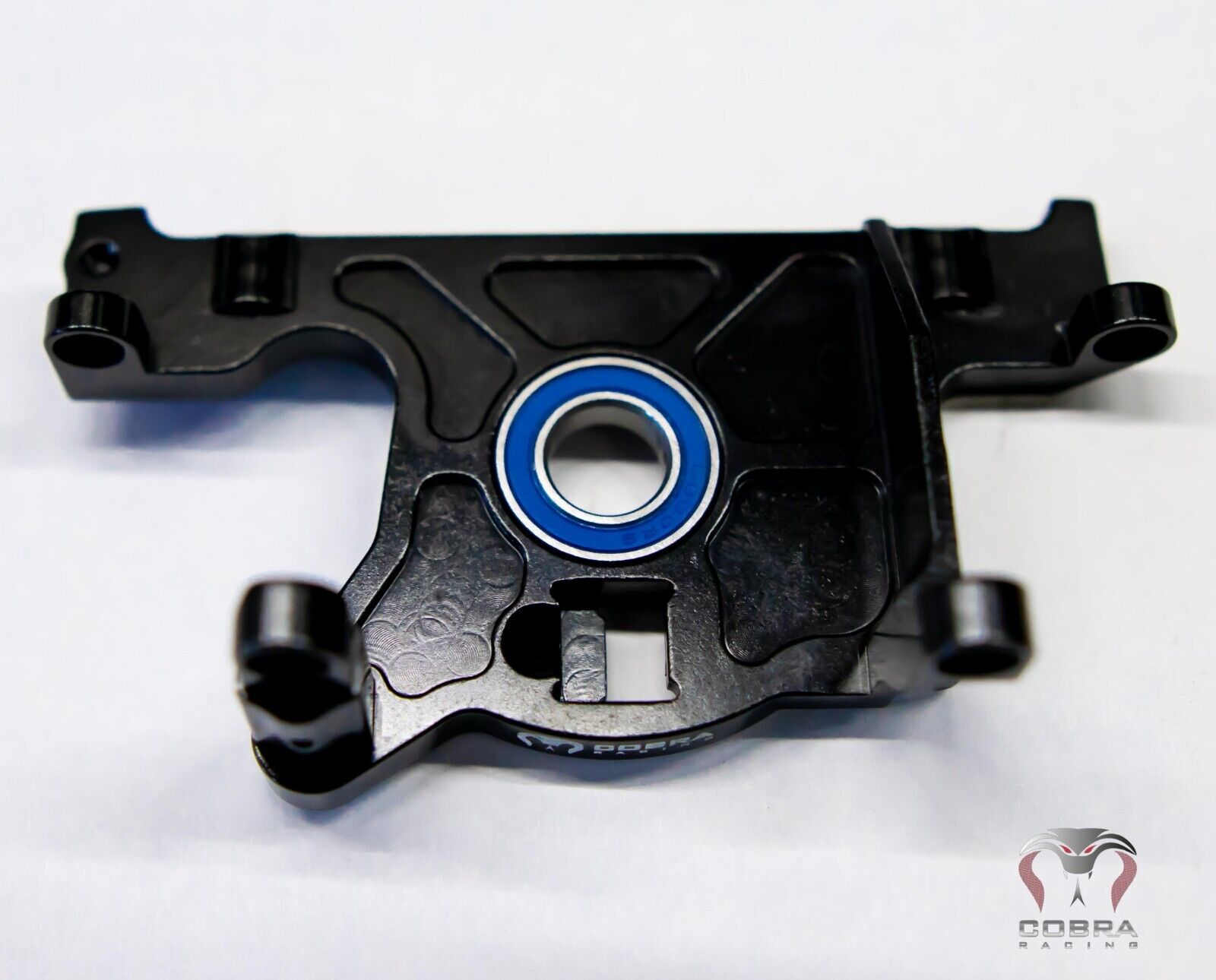 COBRA RACING all Aluminum motor mount with high quality oversized bearing.  This motor mount is just as much tough as it is beautiful to look at.  Will greatly enhance the durability / drivability of your car.  Extra attention was paid on looks as well.  Comes in black with beautiful silver / chrome outlines that will make this motor mount stand out.