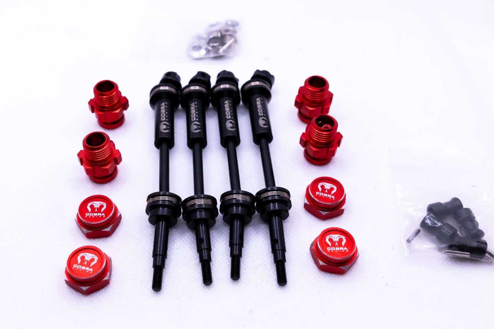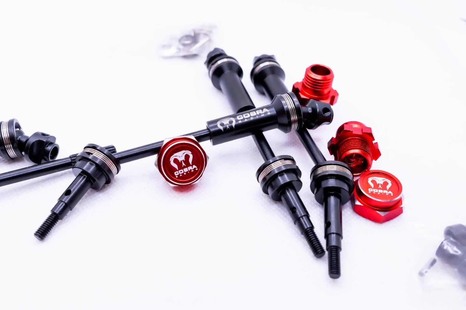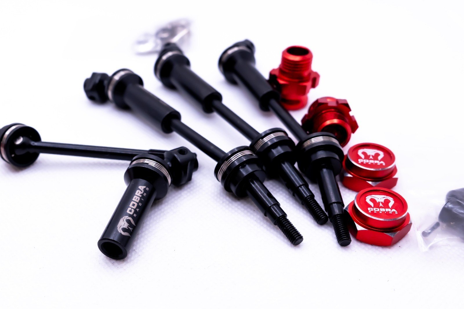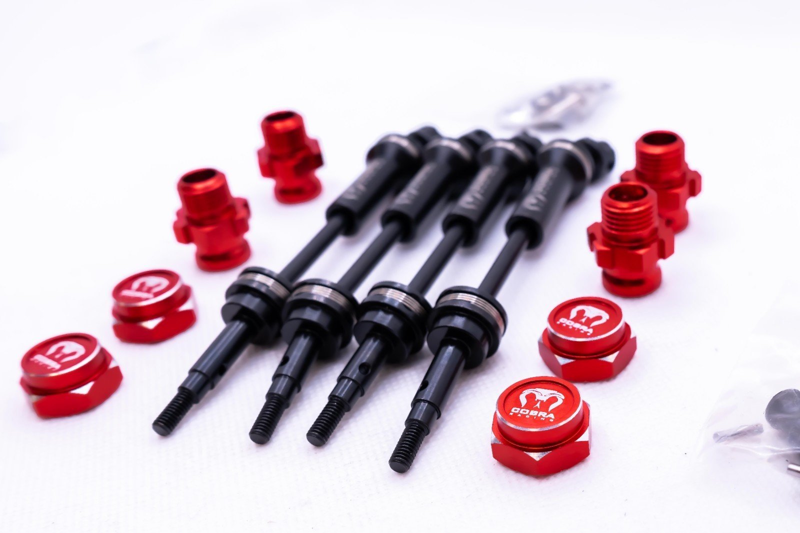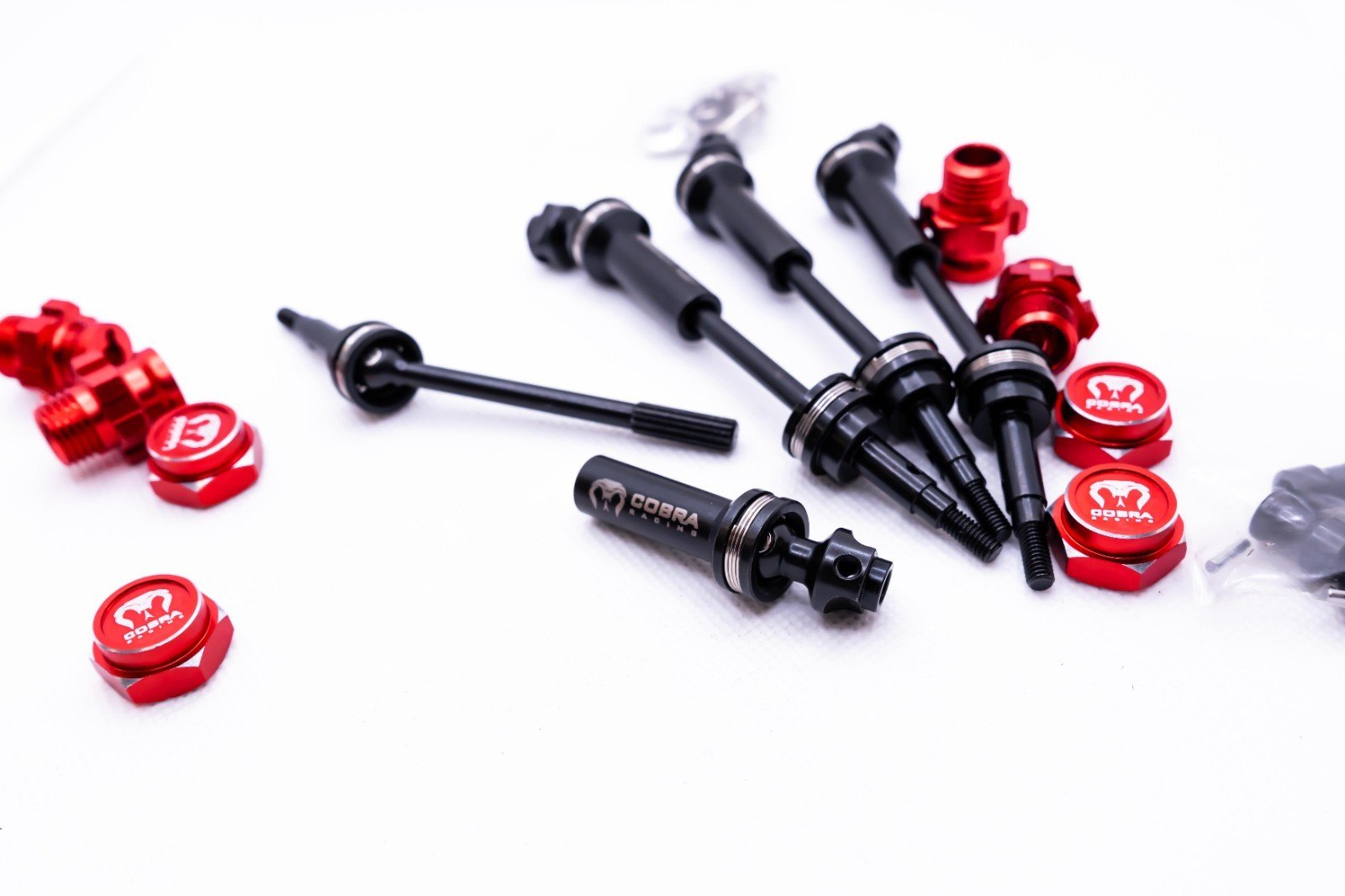 • 🧰 Complete Hardware Kit: 4 CVDs for front & rear, 4×17 mm splined hex adapters, 4 Cobra Racing wheel nuts, hex tool, screws, washers, and spacers for a full install.