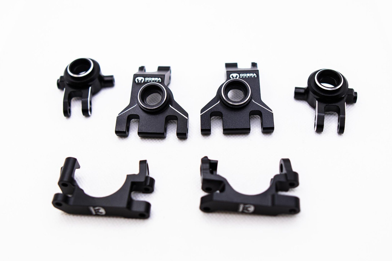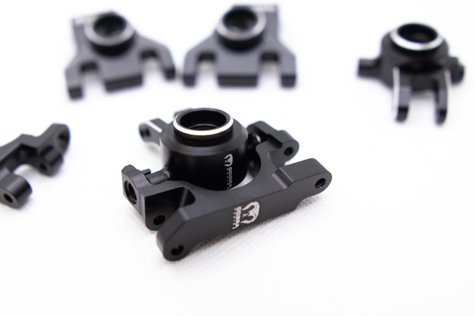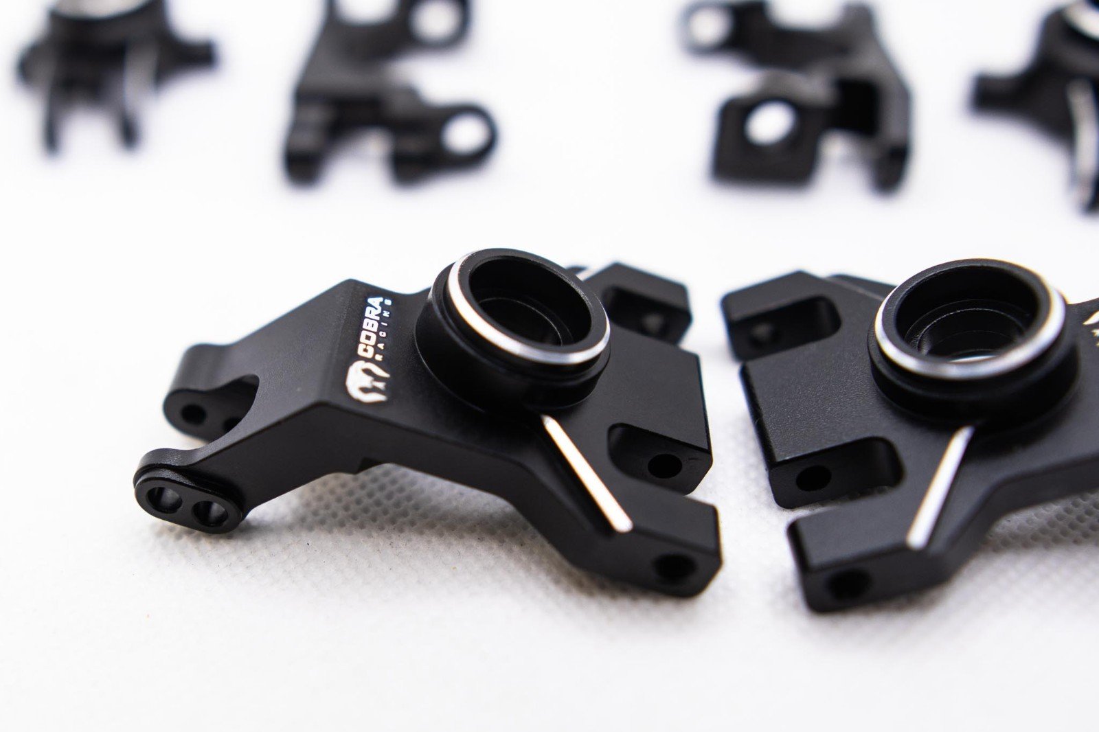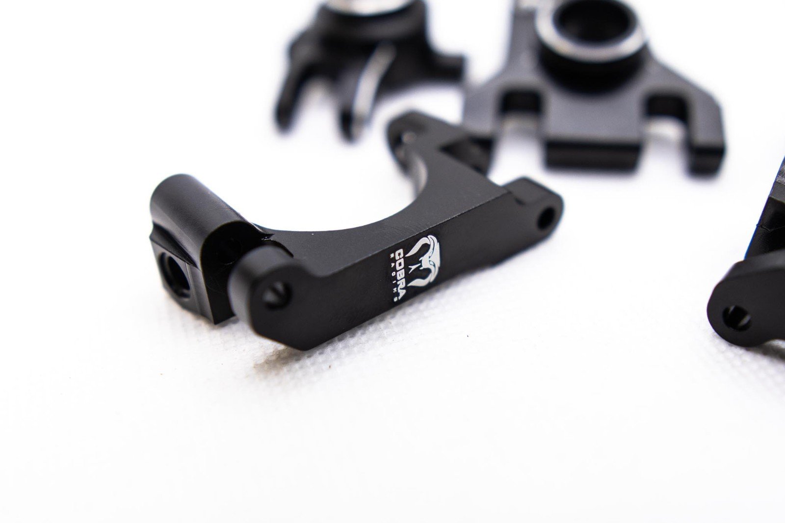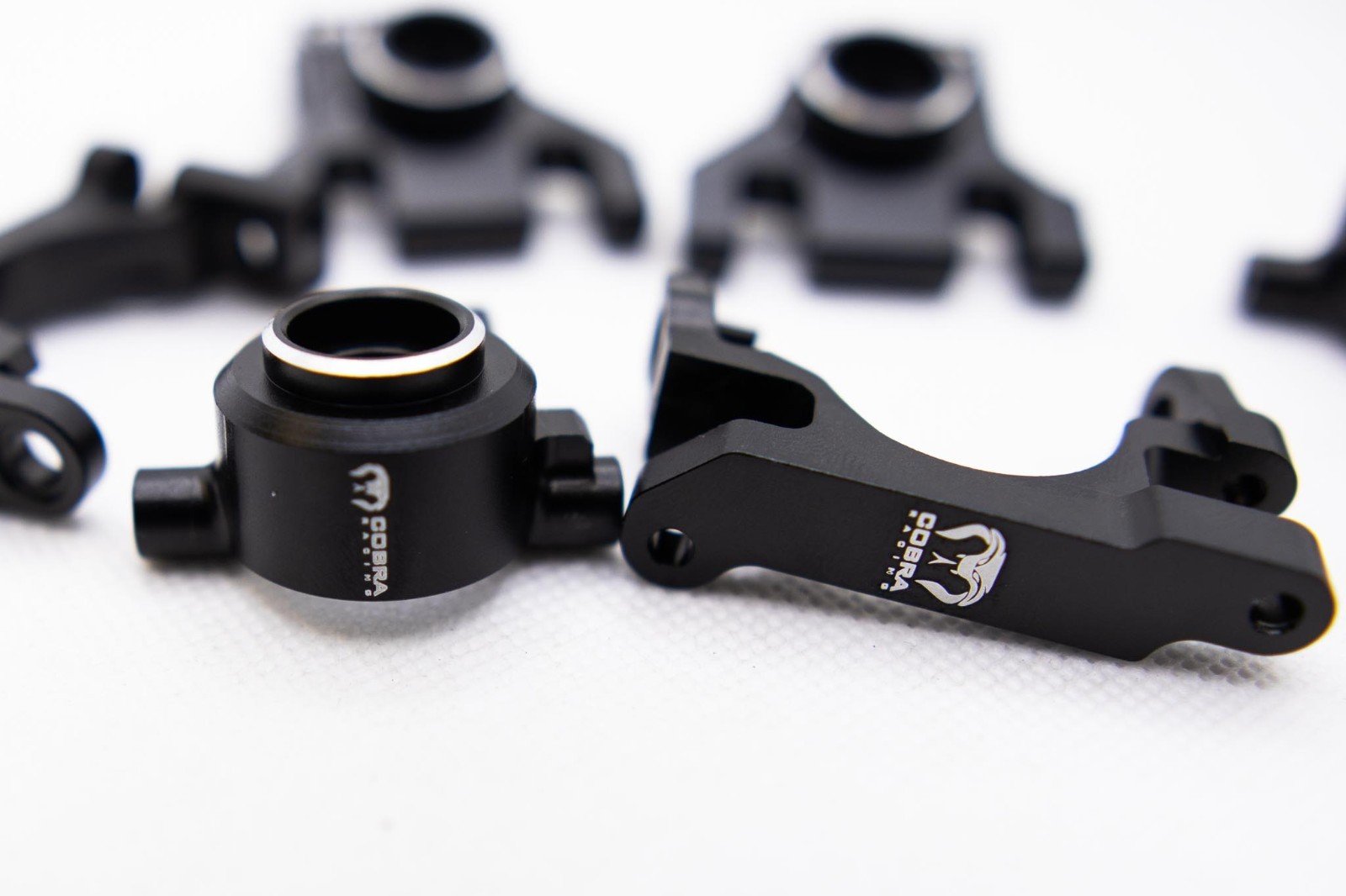 Upgrade your Traxxas 4X4 platform with the Cobra Racing CR 7075 EHD Knuckle Set, engineered from premium 7075-T6 aluminum and finished in a sleek midnight black with precision chrome/silver outlines. This is a complete steering and suspension reinforcement kit, including C-hubs, front knuckles, rear axle carriers, hardware, and rubber-sealed bearings. Designed for drivers who demand uncompromising durability, enhanced precision, and long-term reliability, this heavy-duty set transforms the stability and handling of your RC vehicle.