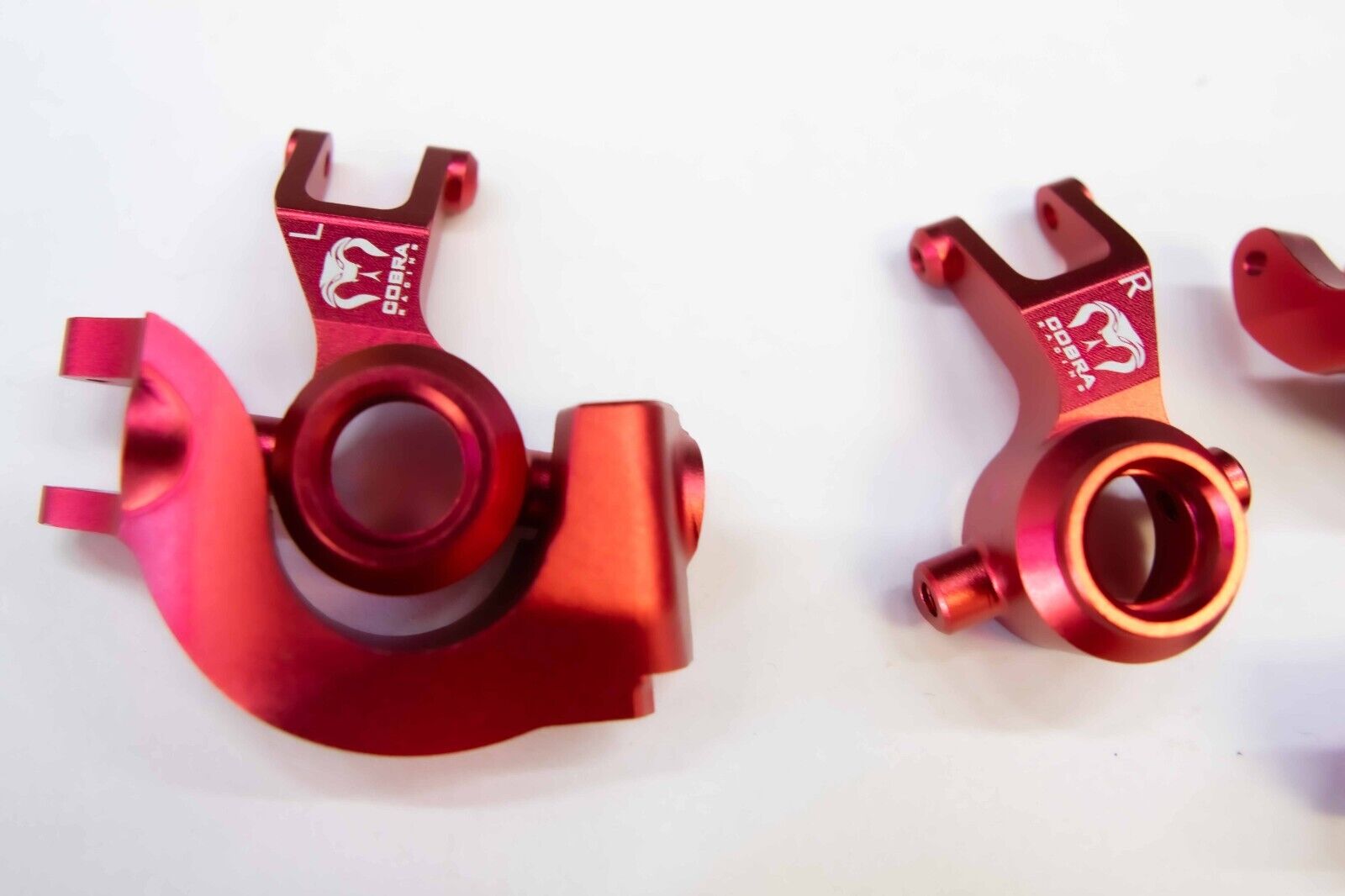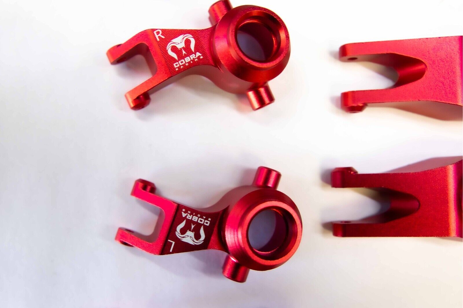 Take your Arrma 1/10th scale vehicle to the next level with the Cobra Racing Arrma Red Knuckle Set (complete set), engineered for durability and precision. Made from high-grade 7075-T6 aluminum, this knuckle set offers superior strength, perfect for withstanding rough conditions and intense RC driving. The stunning Ruby red finish not only adds style but also provides extra corrosion resistance, keeping your vehicle in top shape even after the most challenging runs.